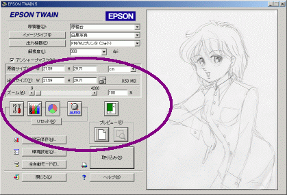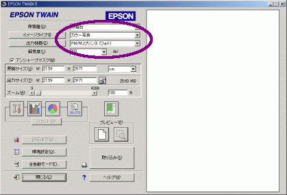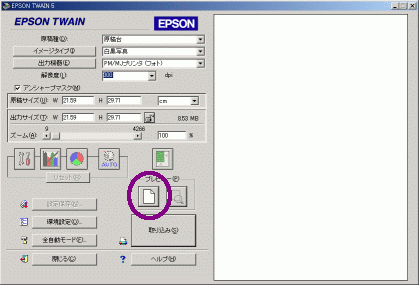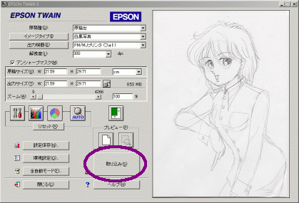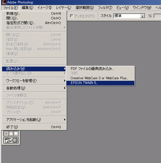 「ファイル」メニューから「読み込み」を選び、さらに「EPSON TWAIN5…」を選ぶ。